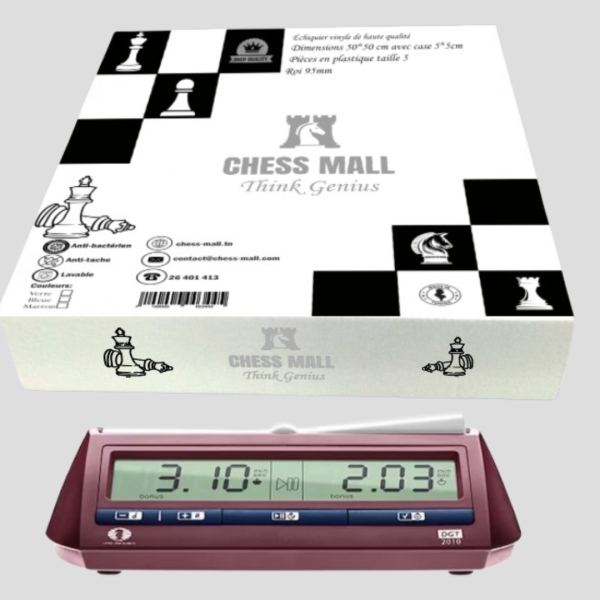 Découvrez notre échiquier en vinyle de haute qualité aux dimensions de 50×50 cm avec des cases de 5,5×5,5 cm. Les pièces sont en plastique de taille 5, avec un roi de 95 mm, et 2 reines supplémentaires pour enrichir votre jeu. + Pendule Électronique DGT FIDE 2010