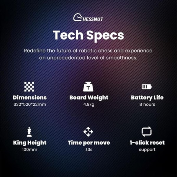 - Commande vocale : Contrôlez l'échiquier en mode mains libres grâce à de simples commandes vocales, ce qui facilite le réglage des paramètres ou le déplacement des pièces, améliorant ainsi votre expérience d'échecs interactive et offrant un plus grand confort pendant le jeu.
