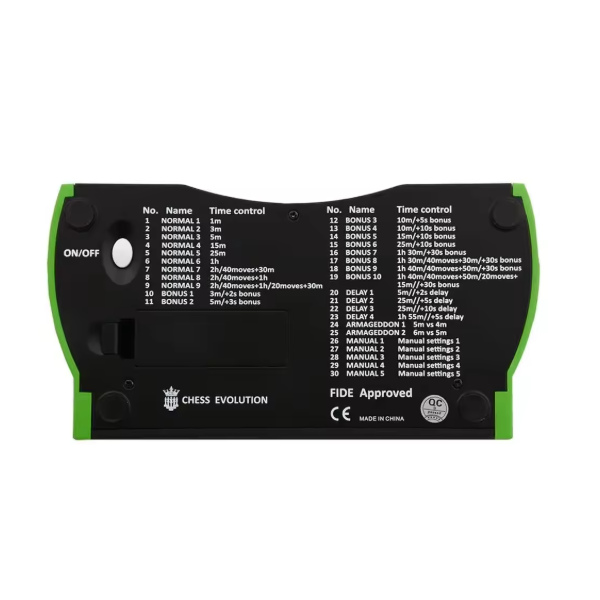 • Tous les contrôles de temps officiels FIDE (comme le compte à rebours simple/multiple, nombre de coups limité, bonus, délai, blitz, etc.) sont préprogrammés dans la pendule, et d'autres réglages peuvent être configurés manuellement.